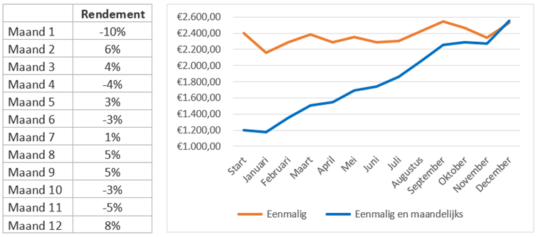 U ziet dat de periodieke inleg (de blauwe lijn) u een perceptievoordeel geeft. In de grafiek ziet u een mooie opgaande blauwe lijn. Dit voelt natuurlijk een stuk prettiger. Ondanks een negatief rendement van -10% in de eerste maand, stijgen uw beleggingen. Elke maand komt er namelijk weer 100 euro bij. De andere oranje lijn ziet er minder rooskleurig uit, want die is vlakker. U ziet pas na tien maanden een positief resultaat.